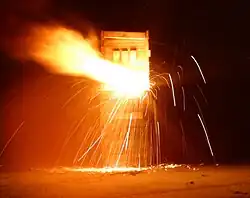 A classic military use for thermite is disabling artillery pieces, and it has been used for this purpose since World War II, such as at Pointe du Hoc, Normandy.[54] Because it permanently disables artillery pieces without the use of explosive charges, thermite can be used when silence is necessary to an operation. This can be accomplished by inserting one or more armed thermite grenades into the breech, then quickly closing it; this welds the breech shut and makes loading the weapon impossible.[55]