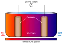 In electrochemistry, a thermogalvanic cell is a kind of galvanic cell in which heat is employed to provide electrical power directly.[1][2] These cells are electrochemical cells in which the two electrodes are deliberately maintained at different temperatures. This temperature difference generates a potential difference between the electrodes.[3][4] The electrodes can be of identical composition and the electrolyte solution homogeneous. This is usually the case in these cells.[5] This is in contrast to galvanic cells in which electrodes and/or solutions of different compositions provide the electromotive potential. As long as there is a difference in temperature between the electrodes a current will flow through the circuit. A thermogalvanic cell can be seen as analogous to a concentration cell but instead of running on differences in the concentration/pressure of the reactants they make use of differences in the "concentrations" of thermal energy.[6][7][8] The principal application of thermogalvanic cells is the production of electricity from low-temperature heat sources (waste heat and solar heat). Their energetic efficiency is low, in the range of 0.1% to 1% for conversion of heat into electricity.[7]