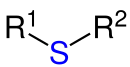 In organic chemistry, a sulfide (British English sulphide) or thioether is an organosulfur functional group with the connectivity R−S−R' as shown on right. Like many other sulfur-containing compounds, volatile sulfides have foul odors.[1] A sulfide is similar to an ether except that it contains a sulfur atom in place of the oxygen. The grouping of oxygen and sulfur in the periodic table suggests that the chemical properties of ethers and sulfides are somewhat similar, though the extent to which this is true in practice varies depending on the application.