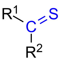 In organic chemistry, thioketones (from Ancient Greek θεῖον (theion) 'sulfur';[1] also known as thiones or thiocarbonyls) are organosulfur compounds related to conventional ketones in which the oxygen has been replaced by a sulfur.[2] Instead of a structure of R2C=O, thioketones have the structure R2C=S, which is reflected by the prefix "thio-" in the name of the functional group. Thus the simplest thioketone is thioacetone, the sulfur analog of acetone. Unhindered alkylthioketones typically tend to form polymers or rings.[3][4]
