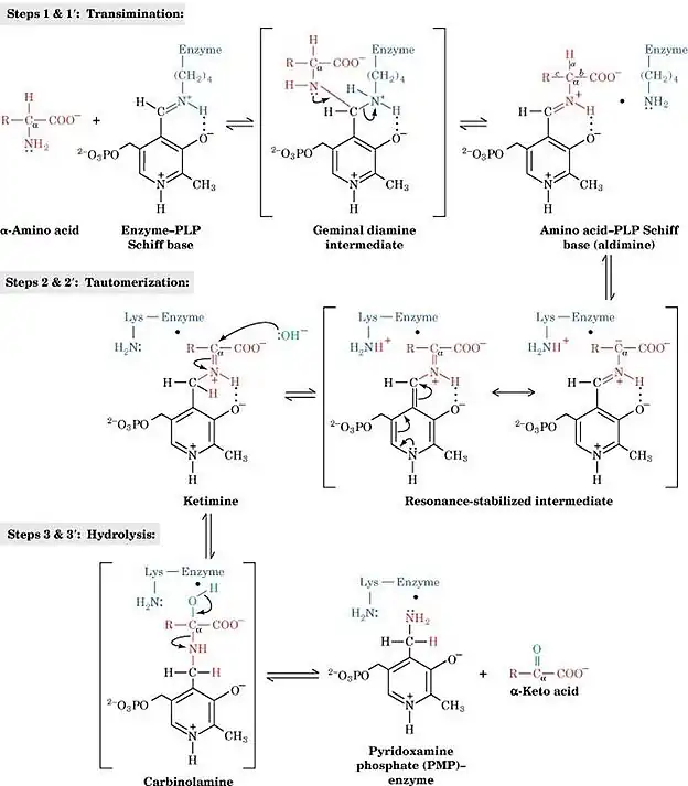 Transamination catalyzed by aminotransferase occurs in two stages. In the first step, the α amino group of an amino acid is transferred to the enzyme, producing the corresponding α-keto acid and the aminated enzyme. During the second stage, the amino group is transferred to the keto acid acceptor, forming the amino acid product while regenerating the enzyme. The chirality of an amino acid is determined during transamination. For the reaction to complete, aminotransferases require participation of aldehyde containing coenzyme, pyridoxal-5'-phosphate (PLP), a derivative of Pyridoxine (Vitamin B6). The amino group is accommodated by conversion of this coenzyme to pyridoxamine-5'-phosphate (PMP). PLP is covalently attached to the enzyme via a Schiff Base linkage formed by the condensation of its aldehyde group with the ε-amino group of an enzymatic Lys residue. The Schiff base, which is conjugated to the enzyme's pyridinium ring, is the focus of the coenzyme activity.