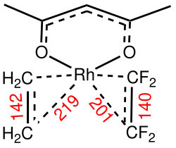 - ↑ Cramer, Richard; Kline, Jules B.; Roberts, John D. (1969). "Bond Character and Conformational Equilibration of Ethylene- and Tetrafluoroethylenerhodium Complexes from Nuclear Magnetic Resonance Spectra". Journal of the American Chemical Society. 91 (10): 2519–2524. doi:10.1021/ja01038a021.