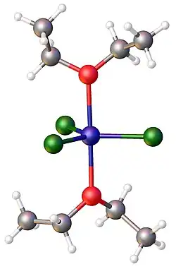 Ethers are L-type ligands. They are σ-donors that exert weak field ligands. They resemble water ligands as seen in aquo complexes. They do not, however, readily participate in hydrogen bonding. The ether oxygen is nearly trigonal planar in its complexes.[4]