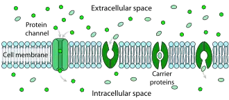 Facilitated diffusion in cell membranes, showing ion channels and carrier proteins