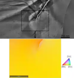 - ↑ Yu, Hongbing; Liu, Junliang; Karamched, Phani; Wilkinson, Angus J.; Hofmann, Felix (2019). "Mapping the full lattice strain tensor of a single dislocation by high angular resolution transmission Kikuchi diffraction (HR-TKD)". Scripta Materialia. 164: 36–41. arXiv:1808.10055. doi:10.1016/j.scriptamat.2018.12.039. S2CID 119075799.