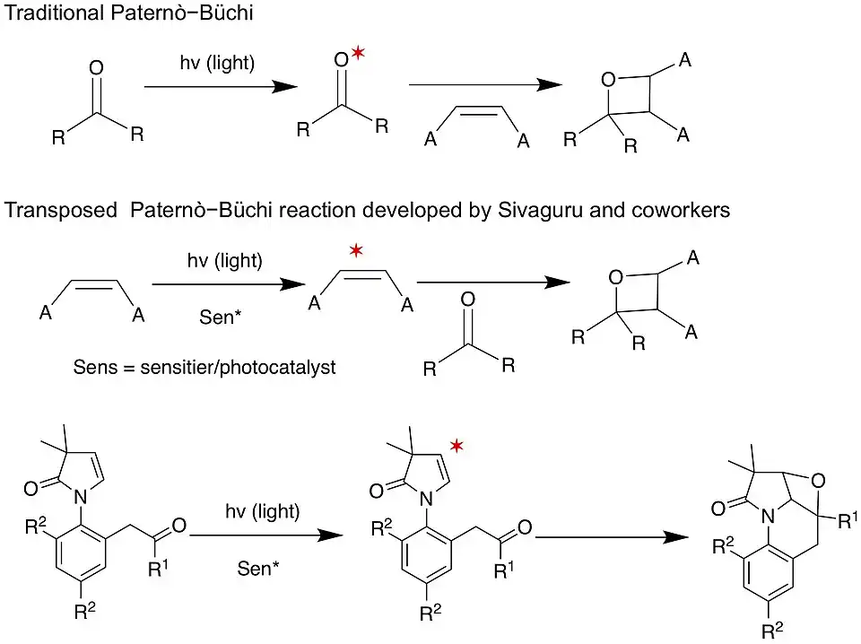 The transposed Paternò−Büchi reaction involves a ππ* excited state of alkene reacting with a ground state carbonyl functionality. This is reversal of the traditional Paternò−Büchi reaction where an excited carbonyl group reacts with a ground state alkene. This strategy was first reported by Sivaguru and co-workers with reaction of enamides.[1]