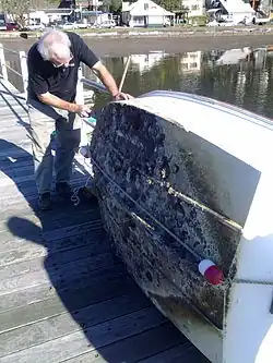 Tributyltin (TBT) is an umbrella term for a class of organotin compounds which contain the (C4H9)3Sn group, with a prominent example being tributyltin oxide.[1] For 40 years TBT was used as a biocide in anti-fouling paint, commonly known as bottom paint, applied to the hulls of oceangoing vessels.[2] Bottom paint improves ship performance and durability as it reduces the rate of biofouling, the growth of organisms on the ship's hull. The TBT slowly leaches out into the marine environment where it is highly toxic toward nontarget organisms. TBT toxicity can lead to biomagnification or bioaccumulation within such nontarget organisms like invertebrates, vertebrates, and a variety of mammals. TBT is also an obesogen.[3] After it led to collapse of local populations of organisms, TBT was banned.[4]