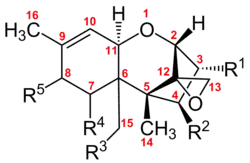 Trichothecenes are a group of over 150 chemically related toxic mycotoxins.[7] Each trichothecene displays a core structure consisting of a six-membered ring containing a single oxygen atom, flanked by two carbon rings.[8] This core ring structure contains an epoxide bridging carbons 12 and 13, as well as a double bond between carbons 9 and 10.[9] These two functional groups are primarily responsible for trichothecenes' ability to inhibit protein synthesis and incur general cytotoxic effects.[10] Notably, this core structure is amphipathic, containing both polar and nonpolar parts.[11] All trichothecenes are related through this common structure but are differentiated by the substitution pattern of oxygen-containing functional groups on carbons 3, 4, 7, 8, and 15.[9] These functional groups govern the properties of an individual trichothecene and also serve as the basis for the most commonly used classification system for this family of toxins. This classification system breaks up the trichothecene family into four groups: Type A, B, C, and D.