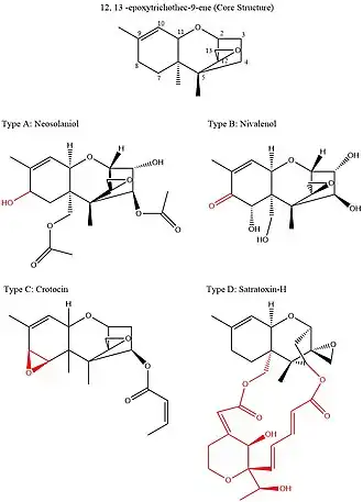- Type B trichothecenes are classified by the presence of oxo-substitutions around the core ring structure.[8] Common examples of these include nivalenol and trichothecene, which both have a ketone functional group at carbon 8.