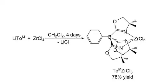 The first coordination complexes made using ToM ligands were based around zirconium (IV), as the sterically bulky ligands were able to stabilise the highly reactive metal centers. ToMZr(IV) complexes were prepared by salt metathesis using LiToM and TlToM and ZrCl4. The formed complex ToMZrCl3 was found to be quite robust and showed C3V symmetry in both solution and solid state.[4]