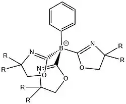 Tris(oxazolinyl)borate compounds are a class of tridentate ligands; often abbreviated ToR, where R is the substituent on the oxazoline ring. Most commonly the substituent is either a methyl, propyl, tert-butyl or hydrogen. The formation of anionic boron backbone with addition of a phenyl group on boron allows the ligand to strongly bind to the metal center. It results in a more robust complex.[1]