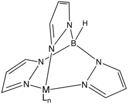 The trispyrazolylborate ligand, abbreviated Tp−, is an anionic tridentate and tripodal ligand. Trispyrazolylborate refers specifically to the anion [HB(C3N2H3)3]−. However, the term can also be used to refer to derivatives having substituents on the pyrazolyl rings. This class of compounds belongs to the family of ligands called scorpionate ligands.[1][2]
