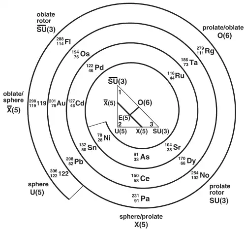 - ↑ It was already known by the 1960s that ground states of nuclei differed in energy and shape as well as that certain magic numbers of nucleons corresponded to greater stability of a nucleus. However, it was assumed that there was no nuclear structure in superheavy nuclei as they were too deformed to form one.[32]