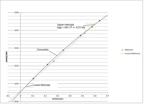 Loss (leakage) of lead from the sample will result in a discrepancy in the ages determined by each decay scheme. This effect is referred to as discordance and is demonstrated in Figure 1. If a series of zircon samples has lost different amounts of lead, the samples generate a discordant line. The upper intercept of the concordia and the discordia line will reflect the original age of formation, while the lower intercept will reflect the age of the event that led to open system behavior and therefore the lead loss; although there has been some disagreement regarding the meaning of the lower intercept ages.[6]