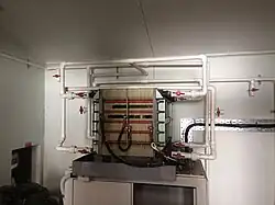 The vanadium redox battery (VRB), also known as the vanadium flow battery (VFB) or vanadium redox flow battery (VRFB), is a type of rechargeable flow battery. It employs vanadium ions as charge carriers.[6] The battery uses vanadium's ability to exist in a solution in four different oxidation states to make a battery with a single electroactive element instead of two.[7] For several reasons, including their relative bulkiness, vanadium batteries are typically used for grid energy storage, i.e., attached to power plants/electrical grids.[8]