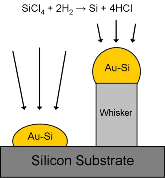 The VLS mechanism was proposed in 1964 as an explanation for silicon whisker growth from the gas phase in the presence of a liquid gold droplet placed upon a silicon substrate.[1] The explanation was motivated by the absence of axial screw dislocations in the whiskers (which in themselves are a growth mechanism), the requirement of the gold droplet for growth, and the presence of the droplet at the tip of the whisker during the entire growth process.