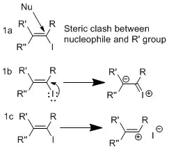Vinyl iodides are generally stable under nucleophilic conditions. In SN2 reactions, back-attack is difficult because of steric clash of R groups on carbon adjacent to electrophilic center (see figure 1a).[2] In addition, the lone pair on iodide donates into the ╥* of the alkene, which reduces electrophilic character on the carbon as a result of decreased positive charge. Also, this stereoelectronic effect strengthens the C-I bond, thus making removal of the iodide difficult (see figure 1b).[3] In SN1 case, dissociation is difficult because of the strengthened C-I bond and loss of the iodide will generate an unstable carbocation(see figure 1c)[2]