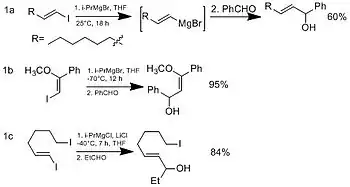 Besides using vinyl iodides as useful substrates in transition metal cross-coupling reaction, they can also undergo elimination with a strong base to give corresponding alkyne, and they can be converted to suitable vinyl Grignard reagents. Vinyl iodides are converted to Grignard reagents by magnesium-halogen exchange (see Scheme 1a).[8] The scope of this synthetic method is limited since it requires higher temperatures and longer reaction time, which affects functional group tolerance. However, vinyl iodide with electron withdrawing group can enhance rate of exchange(see Scheme 1b).[8] Also addition of lithium chloride helps enhance magnesium-halogen exchange (see Scheme 1c). It is predicted lithium chloride breaks up aggregates in organomagnesium reagents.[9]