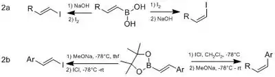 An interesting substitution reaction is vinyl boronic acid to vinyl iodide done by Brown's group.[17] Depending on order of addition of iodide or base, vinyl borate can yield different stereoisomers of vinyl iodide (see scheme 2a). The Whiting group, however, noticed that Brown's method was not applicable to more sterically hindered boronic esters (no reaction).[18] They proposed that the iodide source was not electropositive enough. So they decided to use ICl which is more polar than I2, in which, they observed similar results (see scheme 2b).