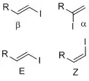 In organic chemistry, a vinyl iodide (also known as an iodoalkene) functional group is an alkene with one or more iodide substituents. Vinyl iodides are versatile molecules that serve as important building blocks and precursors in organic synthesis. They are commonly used in carbon-carbon forming reactions in transition-metal catalyzed cross-coupling reactions, such as Stille reaction, Heck reaction, Sonogashira coupling, and Suzuki coupling.[1] Synthesis of well-defined geometry or complexity vinyl iodide is important in stereoselective synthesis of natural products and drugs.