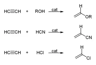 As originally developed by Walter Reppe, acetylene participates in a variety of metal- or base-catalyzed reaction to afford vinyl derivatives.[6][7] Alcohols, thiols, and secondary amines add to acetylene to give the vinyl ethers, vinyl sulfides, and vinyl amines, respectively.[8]