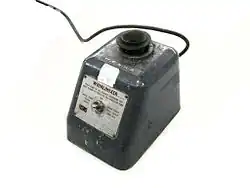 A vortex mixer, or vortexer, is a simple device used commonly in laboratories to mix small vials of liquid. It consists of an electric motor with the drive shaft oriented vertically and attached to a cupped rubber piece mounted slightly off-center. As the motor runs the rubber piece oscillates rapidly in a circular motion. When a test tube or other appropriate container is pressed into the rubber cup (or touched to its edge) the motion is transmitted to the liquid inside and a vortex is created. Most vortex mixers are designed with 2 or 4-plate formats, have variable speed settings ranging from 100 to 3,200 rpm, and can be set to run continuously, or to run only when downward pressure is applied to the rubber piece.