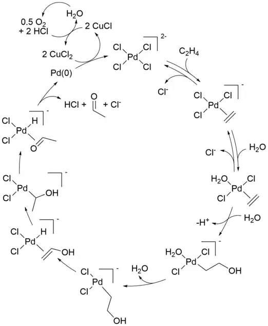 - [PdCl4]2 − + C2H4 + H2O → CH3CHO + Pd + 2 HCl + 2 Cl−