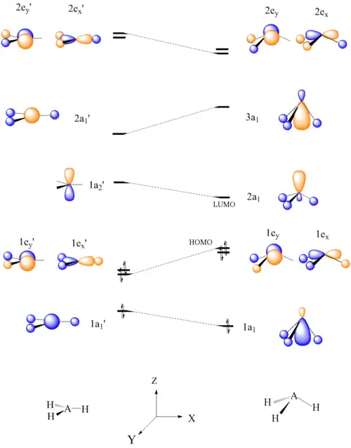 Six electron AH3 molecules should have a planar conformation. It can be seen that the HOMO, 1e’, of planar AH3 is destabilized upon bending of the A-H bonds to form a pyramid shape, due to disruption of bonding. The LUMO, which is concentrated on one atomic center, is a good electron acceptor and explains the Lewis acid character of BH3 and CH3+.[22]