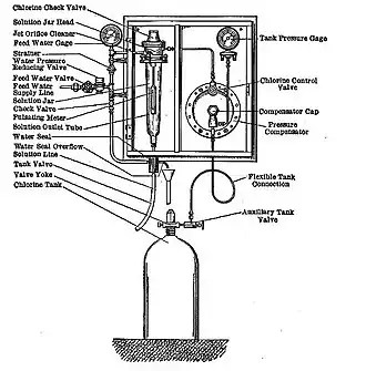 Chlorine gas was first used on a continuing basis to disinfect the water supply at the Belmont filter plant, Philadelphia, Pennsylvania by using a machine invented by Charles Frederick Wallace who dubbed it the Chlorinator. It was manufactured by the Wallace & Tiernan company beginning in 1913.[13] By 1941, disinfection of U.S. drinking water by chlorine gas had largely replaced the use of chloride of lime.[14][15]