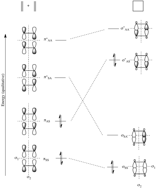 This is made precise in the state correlation diagram below.[16][20] The ground state in the starting materials is the electronic state where πSS and πAS are both doubly populated – i.e. the state (SS)2(AS)2. As such, this state attempts to correlate with the electronic state in the product where both σSS and σ*AS are doubly populated – i.e. the state (SS)2(AS)2. However, this state is neither the ground state (SS)2(SA)2 of cyclobutane, nor the first excited state ES-1'=(SS)2(SA)(AS), where an electron is promoted from the HOMO to the LUMO.