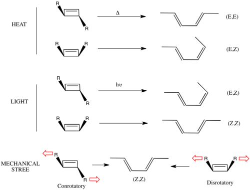 Similarly, a recent paper describes how mechanical stress can be used to reshape chemical reaction pathways to lead to products that apparently violate Woodward–Hoffman rules.[33] In this paper, they use ultrasound irradiation to induce a mechanical stress on link-functionalized polymers attached syn or anti on the cyclobutene ring. Computational studies predict that the mechanical force, resulting from friction of the polymers, induces bond lengthening along the reaction coordinate of the conrotatory mechanism in the anti-bisubstituted-cyclobutene, and along the reaction coordinate of the disrotatory mechanism in the syn-bisubstituted-cyclobutene. Thus in the syn-bisubstituted-cyclobutene, the anti-WH product is predicted to be formed.