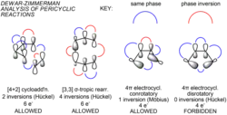 - ↑ The original statement given by Woodward and Hoffmann is somewhat more elaborate: A ground-state pericyclic change is symmetry-allowed when the total number of (4q+2)s and (4r)a components is odd. However, the statement given here is mathematically equivalent. For a proof, see: https://archive.org/details/whdz_red
