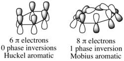In the intervening four years, Howard Zimmerman[3][4] and Michael J. S. Dewar[5][6] proposed an equally general conceptual framework: the Möbius-Hückel concept, or aromatic transition state theory. In the Dewar-Zimmerman approach the orbital overlap topology (Hückel or Möbius) and electron count (4n + 2 or 4n) results in either an aromatic or antiaromatic transition state.
