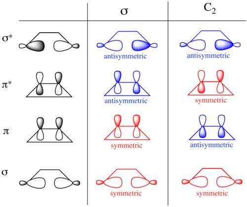The same analysis can be carried out for the molecular orbitals of cyclobutene. The result of both symmetry operations on each of the MOs is shown to the left. As the σ and σ* orbitals lie entirely in the plane containing C2 perpendicular to σ, they are uniformly symmetric and antisymmetric (respectively) to both symmetry elements. On the other hand, π is symmetric with respect to reflection and antisymmetric with respect to rotation, while π* is antisymmetric with respect to reflection and symmetric with respect to rotation.