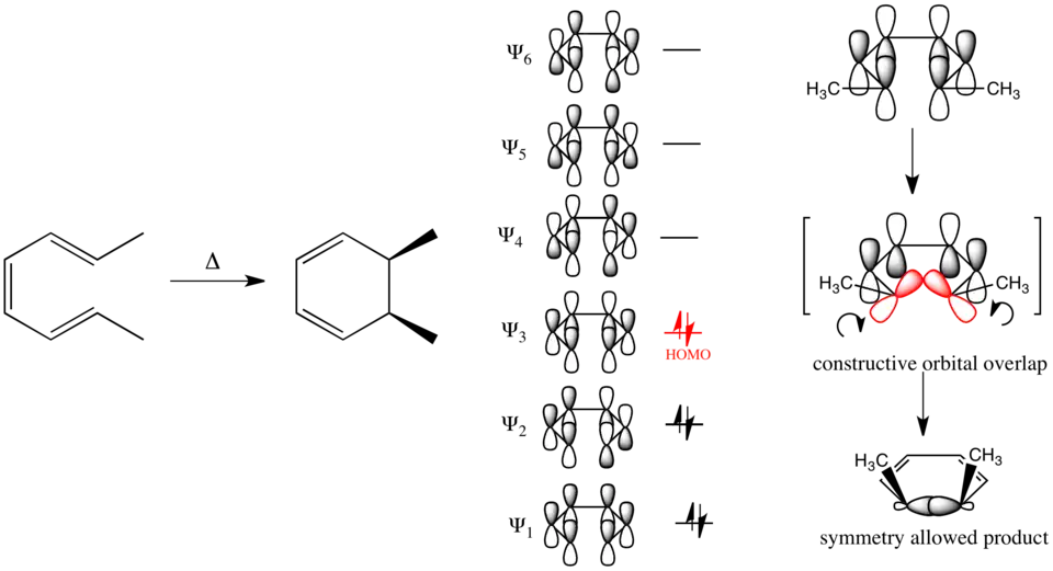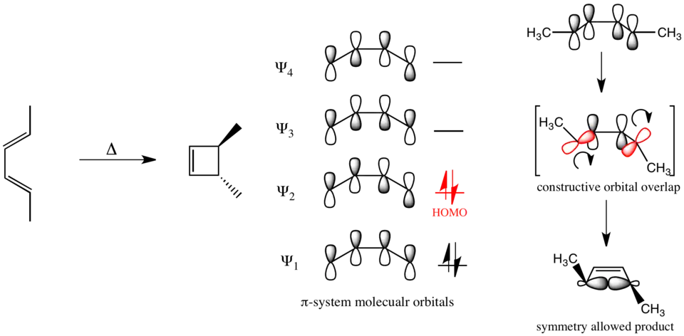 - In an open-chain system containing 4n π electrons, the orbital symmetry of the highest occupied molecule orbital is such that a bonding interaction between the ends must involve overlap between orbital envelopes on opposite faces of the system and this can only be achieved in a conrotatory process.