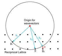 Each X-ray diffraction pattern represents a spherical slice of reciprocal space, as may be seen by the Ewald sphere construction. For a given incident wavevector k0 the only wavevectors with the same energy lie on the surface of a sphere. In the diagram, the wavevector k1 lies on the Ewald sphere and also is at a reciprocal lattice vector g1 so satisfies Bragg's law. In contrast the wavevector k2 differs from the reciprocal lattice point and g2 by the vector s which is called the excitation error. For large single crystals primarily used in crystallography only the Bragg's law case matters; for electron diffraction and some other types of x-ray diffraction non-zero values of the excitation error also matter.[22]