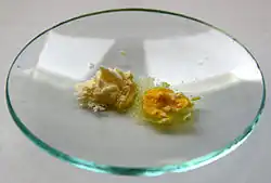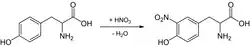 The xanthoproteic reaction is a method that can be used to detect a presence of protein soluble in a solution, using concentrated nitric acid. The test gives a positive result in amino acids carrying aromatic groups, especially in the presence of tyrosine. If the test is positive the proof is neutralized with an alkali, turning dark yellow. The yellow colour is due to xanthoproteic acid which is formed due to nitration of certain amino acids, most common examples being tyrosine and tryptophan.[1] This chemical reaction is a qualitative test, determining the presence or absence of proteins.