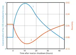 When reactor power is decreased or shut down by inserting neutron-absorbing control rods, the reactor neutron flux is reduced and the equilibrium shifts initially towards higher 135Xe concentration. The 135Xe concentration peaks about 11.1 hours after reactor power is decreased. Since 135Xe has a 9.2 hour half-life, the 135Xe concentration gradually decays back to low levels over 72 hours.