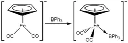 Both uncharged transition metal complexes and anionic complexes lead to the required adducts with acidic boranes. On the right is a typical reaction of a Z-ligand where the electron deficit BPh3 adds to the anionic Fe complex. The presence of Cp and CO ligands further stabilize the Fe-BPh3 bond. More specific examples include [NEt4][CpFe(CO)2] which gives the anionic borane iron complex as an amorphous solid from reaction with BPh3 in diethyl ether. This could even be characterized in solution by a high-field shifted 11B-NMR signal at −28.8 characteristic of fourfold coordinated boron.[7]