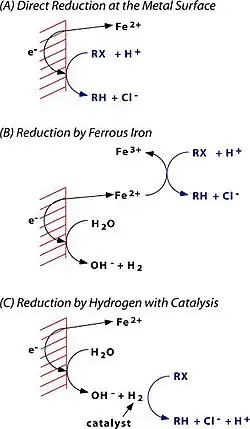 ZVI operates by electron transfer from Fe0 toward some organochlorine compounds, a common class of pollutants. The remediation process is proposed to generate Fe2+ and Cl− and halide-free organic products, all of which are relatively innocuous.[5] Nanoscale ZVIs (nZVIs) are commonly used in remediation of chlorinated compounds and other pollutants.[6]