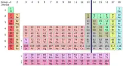 The Zintl line is a hypothetical boundary drawn between groups 13 and 14. It separates the columns based on the tendency for group 13 elements to form metals when reacted with electropositive group 1 or 2 elements and for group 14 and above to form ionic solids.[9] The 'typical salts' formed in these reactions become more metallic as the main group element becomes heavier.[8]