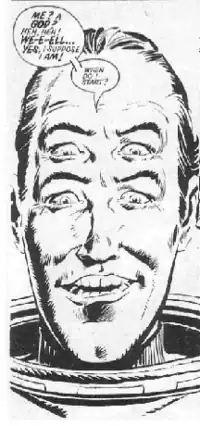 Abelard Snazz, also known as "the man with the two/multi-storey brain", is a genius whose plans nevertheless do not work quite as intended.[1] His first name was likely inspired by Moore's half-memory of having read about the philosopher Peter Abelard, but no specific link was implied. Snazz was Alan Moore's first recurring character for 2000 AD, and appeared in eight issues between 1980 and 1983.[2] Snazz first appeared in Moore's third Ro-Jaws' Robo Tales strip for 2000 AD (and third work overall for that publication), in the two-part story "The Final Solution", in issues #189-190.[3] Moving briefly into the Tharg's Future Shocks for his second storyline (third appearance) in #209, Snazz then gained his own short-lived strip in #237. 'The Man with the Double-Decker Brain' is a mutant with two brains and two sets of eyes (occasionally adorned by two sets of glasses).[4] Convinced - with some accuracy - of his own genius, he acted as a consultant inventor, "offering to handle complex problems with even more complicated solutions," and shared many character traits that Moore would return to with the America's Best Comics character Jack B. Quick in his Tomorrow Stories anthology comic, two decades later.[2][4]