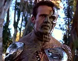 When he auditioned, Hertzberg had no idea what Adam would look like in full costume and make-up. Buffy used a company named Optic Nerve to build the materials to make Hertzberg look like a demonoid. Almost immediately after Hertzberg got the part, Optic Nerve sketched and sculpted Adam's appearance. They had Hertzberg come in to have molds made for prosthetic parts to fit his head and face, arms, chest, and legs, then he was fitted for contact lenses. They also created separate hands and a chest to film for close-up shots. Adam has a floppy disk drive mounted on his chest which, when used, had to be filmed without Hertzberg behind it. The entire construction of Adam's appearance took about two weeks.[28] Hertzberg's voice was also modified post-production. When he saw the full Adam prosthetic and costume, his biggest concern was being able to show nuanced facial expressions under so much latex. It took hours to get Hertzberg into his full costume, but even after it was fully applied on set, often he would have to wait even longer before he went in front of the cameras. He spoke of the need to stay focused during all the waiting while sweating underneath everything he wore for the part.[29]