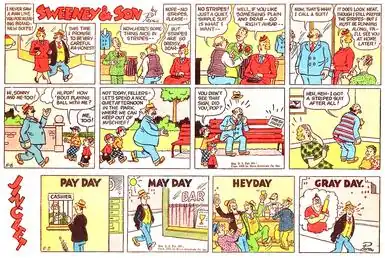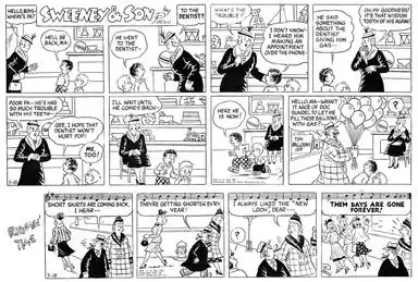 Sweeney & Son debuted as a Sunday page on October 1, 1933, replacing Ella and Her Fella. Sweeney & Son continued for more than 25 years, until August 21, 1960.[5] Jinglet continued to be the topper strip from 1933 to 1950.[3]