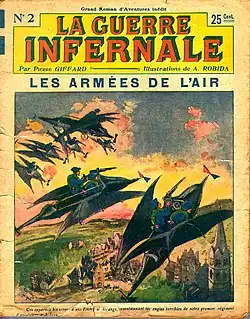 - La Guerre Infernale ("The Infernal War"), a 1908 serial adventure novel for children that appeared weekly every Saturday. Robida contributed 520 illustrations. The novel is set in the future and features uncanny parallels to World War Two, including an attack on London by Germany and a conflict between Japan and the United States. It was subsequently republished as a book.[3]