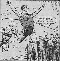 Sometimes his tardiness was caused by skullduggery of the worst kind by "stuck-up" rich boys from a university somewhere, but usually it was because he could not stop himself from rescuing people in distress or just generally being a selfless chap. Regardless of this, he always got there in the nick of time and, having just finished his fish and chips, went on to win the championships or even, in "end of series" stories, break the world record for the mile and utter his famous catchphrase "I ran 'em all!”