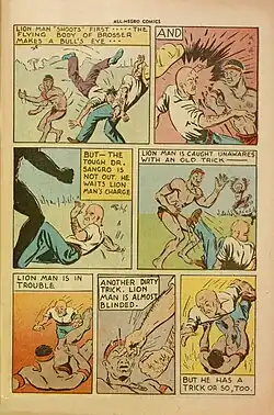 - "Lion Man and Bubba", starring a college-educated African American sent by the United Nations on a mission to a uranium deposit on Africa's Gold Coast, where he adopted the mischievous orphan Bubba. Drawn by George J. Evans, Jr. (no relation to Caucasian comic-book and comic-strip artist George Evans). One modern-day writer said Lion Man "wore the obligatory leotard costume of the comic hero",[12] though the comic's cover and interior pages depict him in loin cloth.