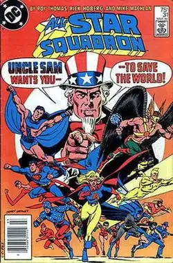 The All-Star Squadron is a DC Comics superhero team that debuted in Justice League of America #193 (August 1981) and was created by Roy Thomas, Rich Buckler and Jerry Ordway.[1] Although the team was introduced in the 1980s, its self-titled series took place in the 1940s, retroactively inserting their narratives into the fictional history of the DC Comics superheroes. The team included many of DC's Golden Age era characters, new characters, and other World War II superheroes which DC did not own during the 1940s but later acquired. The name "All-Star Squadron" was creator Roy Thomas' reference to All Star Comics, the series that introduced the Justice Society of America, the first comic book superhero team.