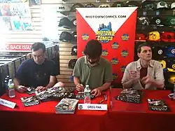 Fred Van Lente, Greg Pak and Mark Paniccia at a signing for Alpha Flight, vol. 4 #1 at Midtown Comics Downtown in Manhattan, June 18, 2011.