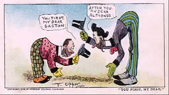 Alphonse and Gaston is an American comic strip by Frederick Burr Opper, featuring a bumbling pair of Frenchmen with a penchant for politeness. It first appeared in William Randolph Hearst's New York Journal on September 22, 1901, with the title "Alphonse a la Carte and His Friend Gaston de Table d'Hote".[1] The strip was later distributed by King Features Syndicate.[2]